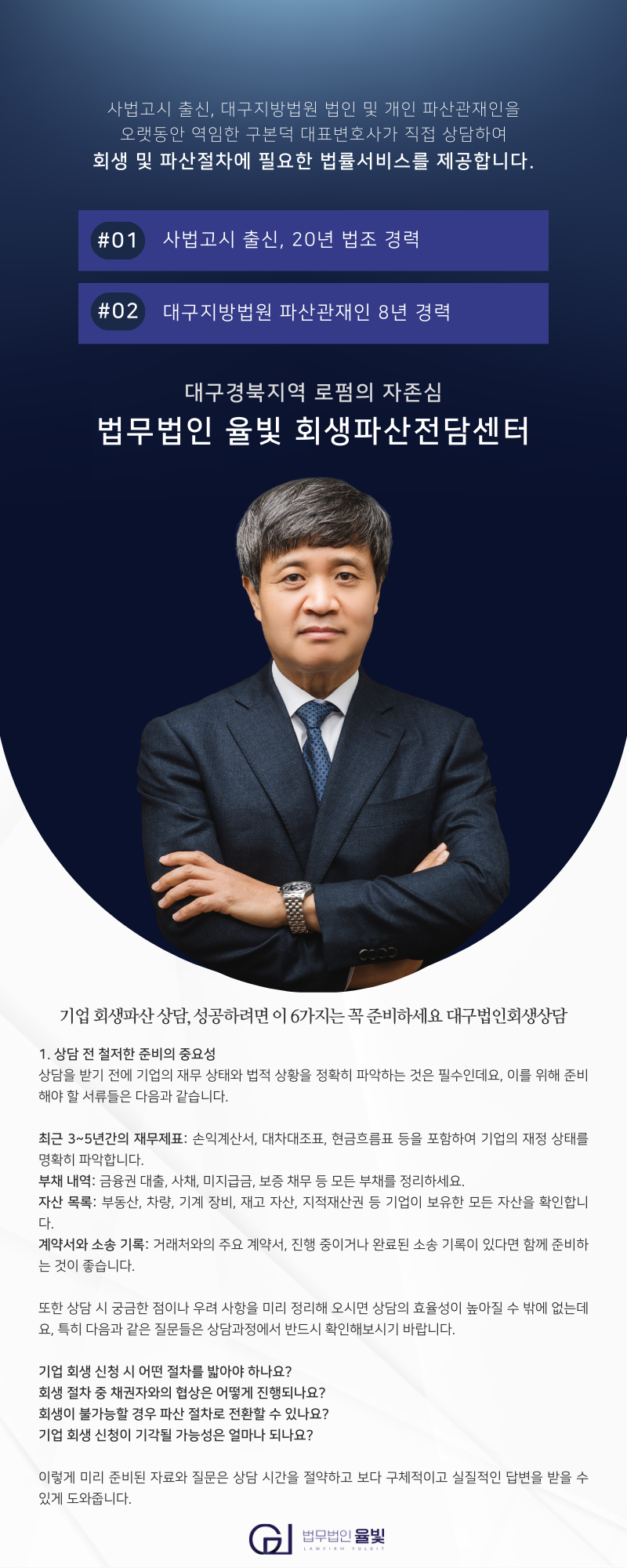 대구법인상담 법무법인 율빛은 법인회생/파산사건 전문변호사 구본덕 대표변호사가 상황별 맞춤 솔루션을 제공하고 있습니다.